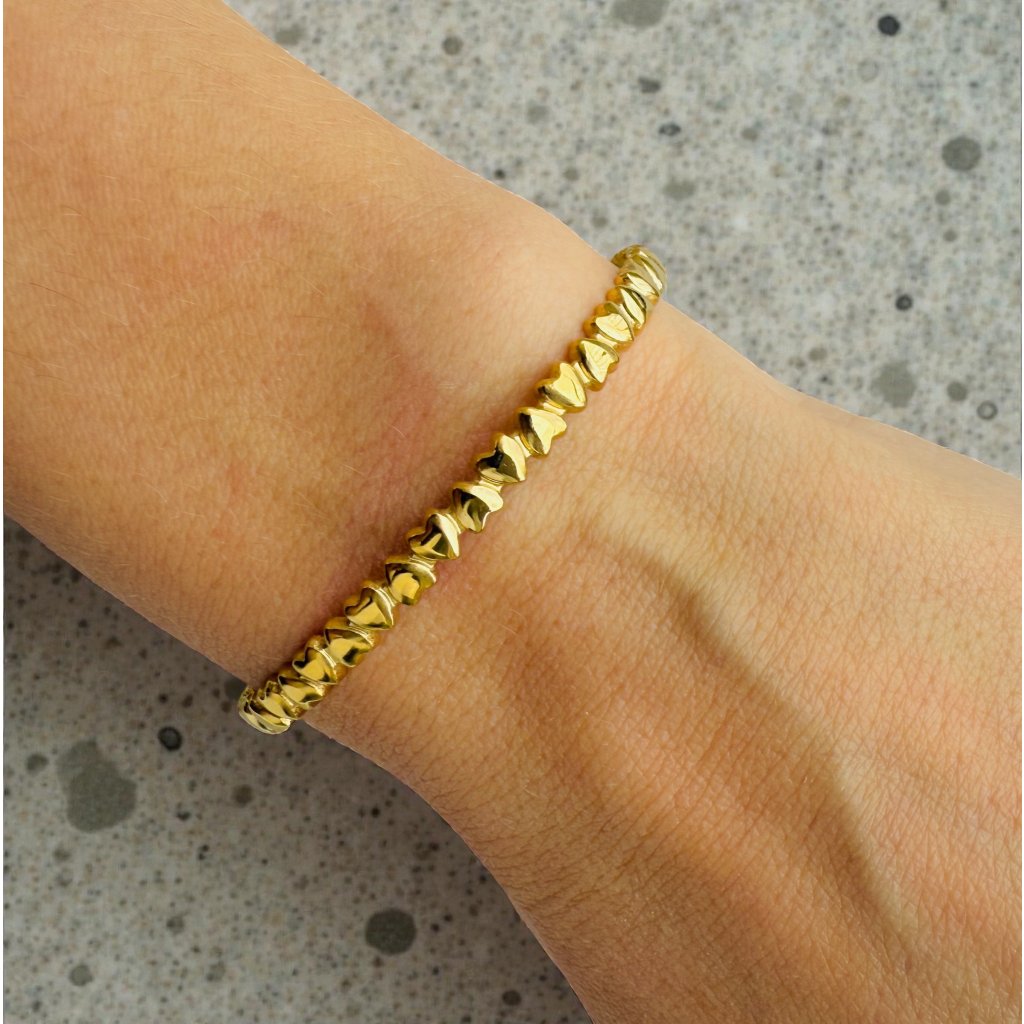 Zlatá láska na tvém zápěstí. Každé srdíčko na tomto náramku je připomínkou něhy, spojení a okamžiků, které chceš mít navždy u sebe. Tenhle náramek je přesně tak jemný, jak vypadá. Lehoučký, zlatý a se srdíčky, co ti připomenou, že máš ráda – a jsi ráda milovaná.