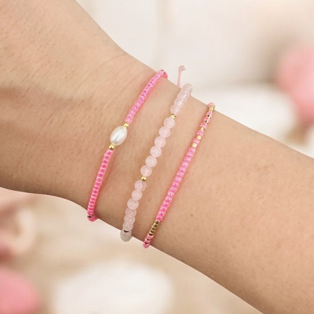 Objevte krásu, která hýčká srdce – trojkombinace náramků v jemných růžových odstínech, propracovaných detailech a z lásky ke kráse. Tento set není jen šperk – je to projev vaší jedinečnosti, připomínka, že i malé věci mohou říct velké příběhy. Set obsahuje tři náramky: jeden z japonských korálků, druhý kombinovaný s říční perlou a korálky a třetí z Růženínu. Každý má svůj charakter a dohromady tvoří symfonii jemnosti a stylu.